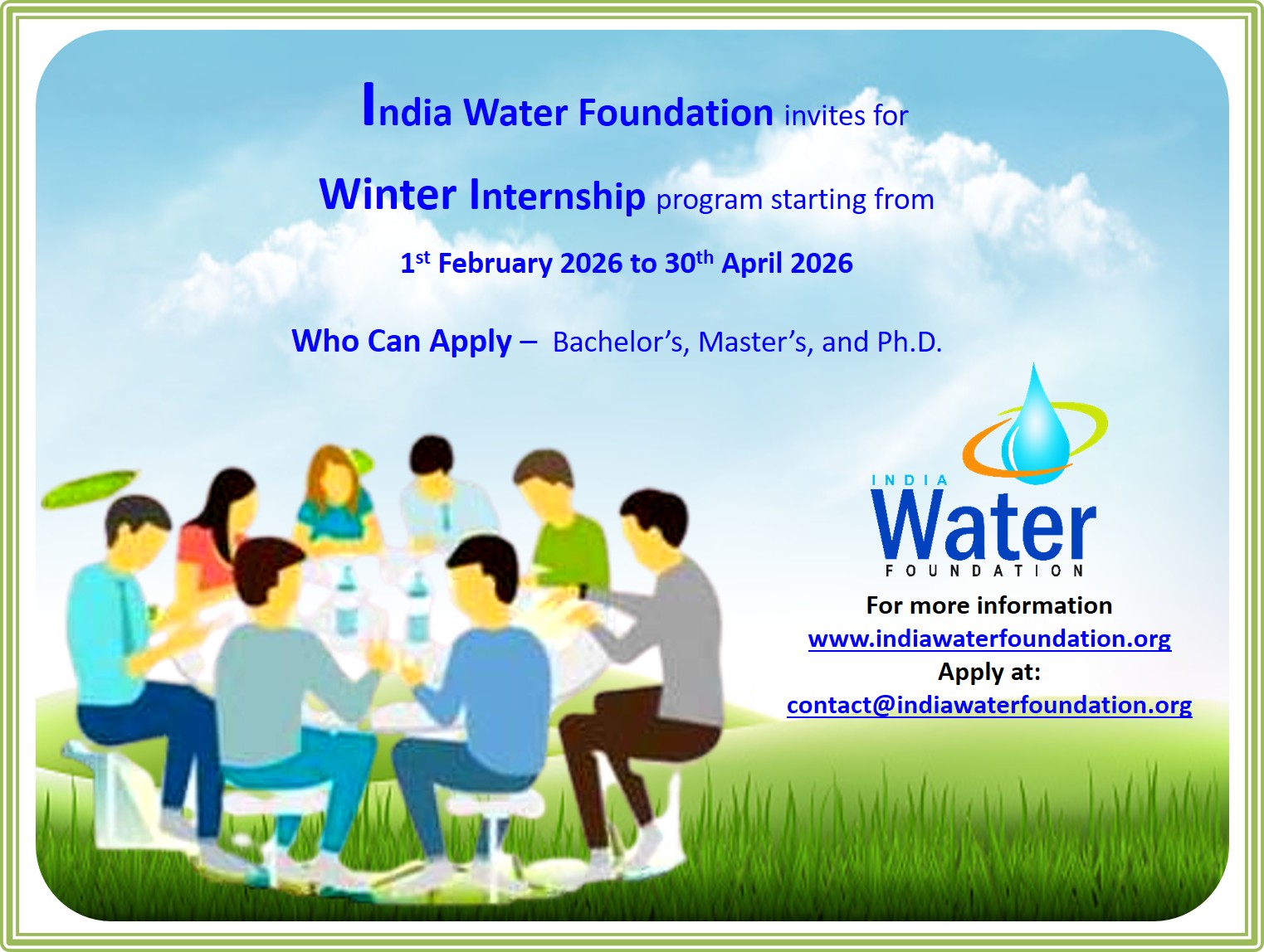 The Intern should be an Enthusiastic, Passionate and Optimistic individual. He / She should be committed towards the realm of Water and Environment and willing to be deeply involved through a problem-solving approach and skill. The intern should either be a graduate, have a masters degree or a PhD student.
